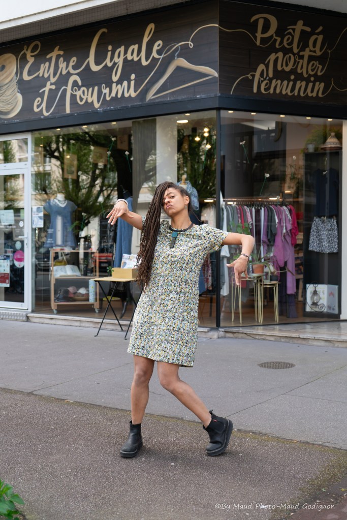 Robe Kali Dress Abstract Blossom Lily and Me – Pendentif Youp, Boucles d’oreilles Sense et Bracelet World La Mollla Tiziana Redavid