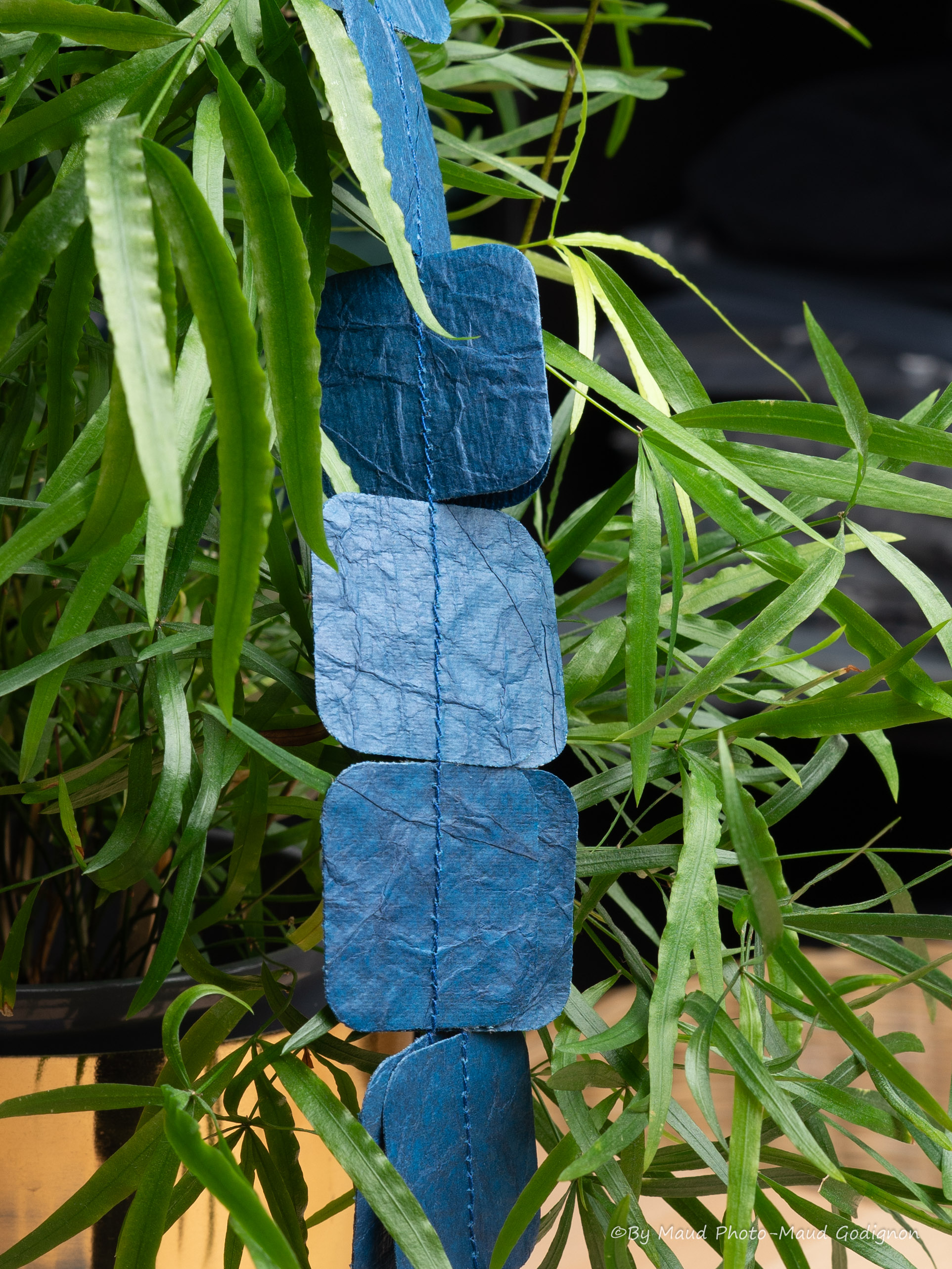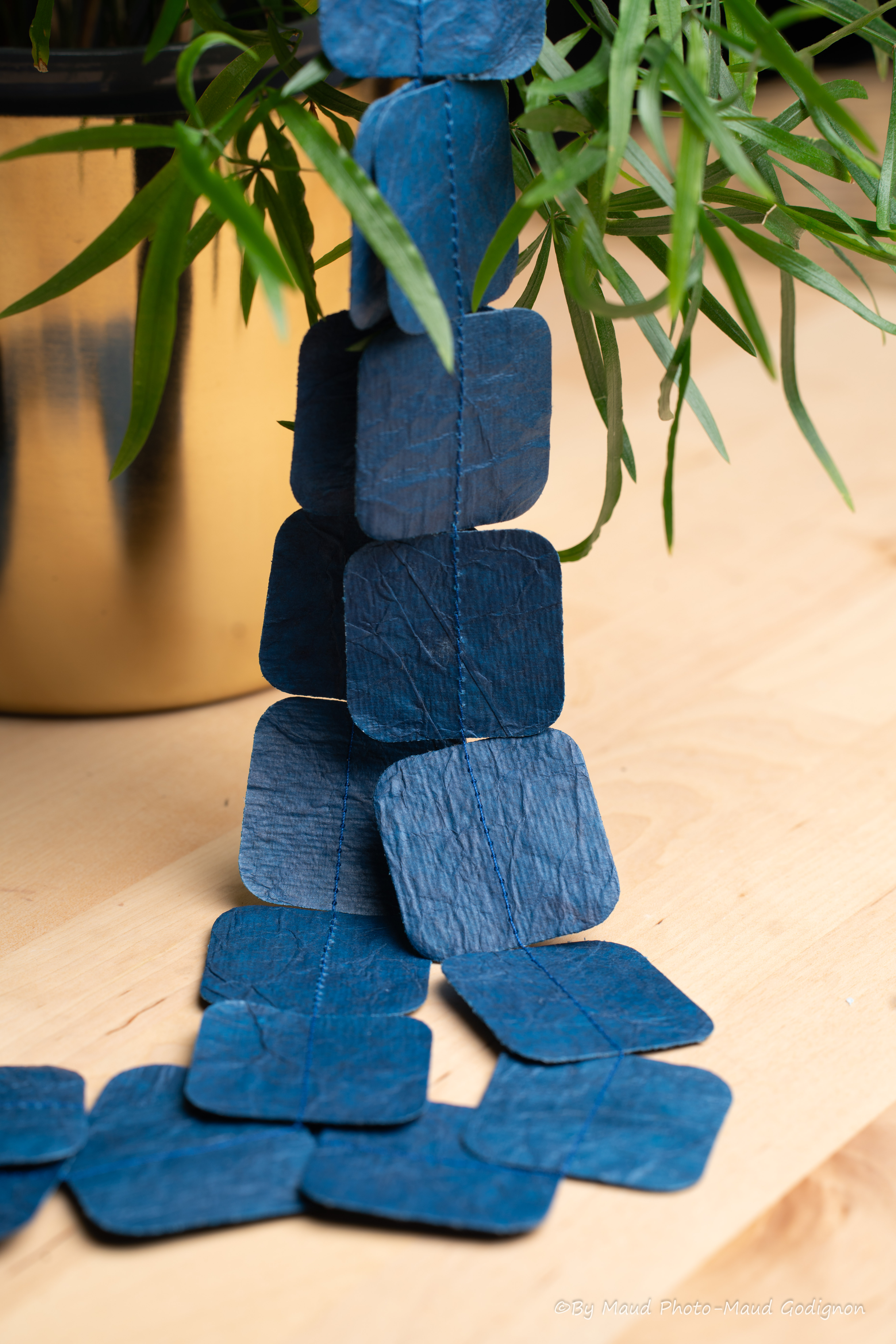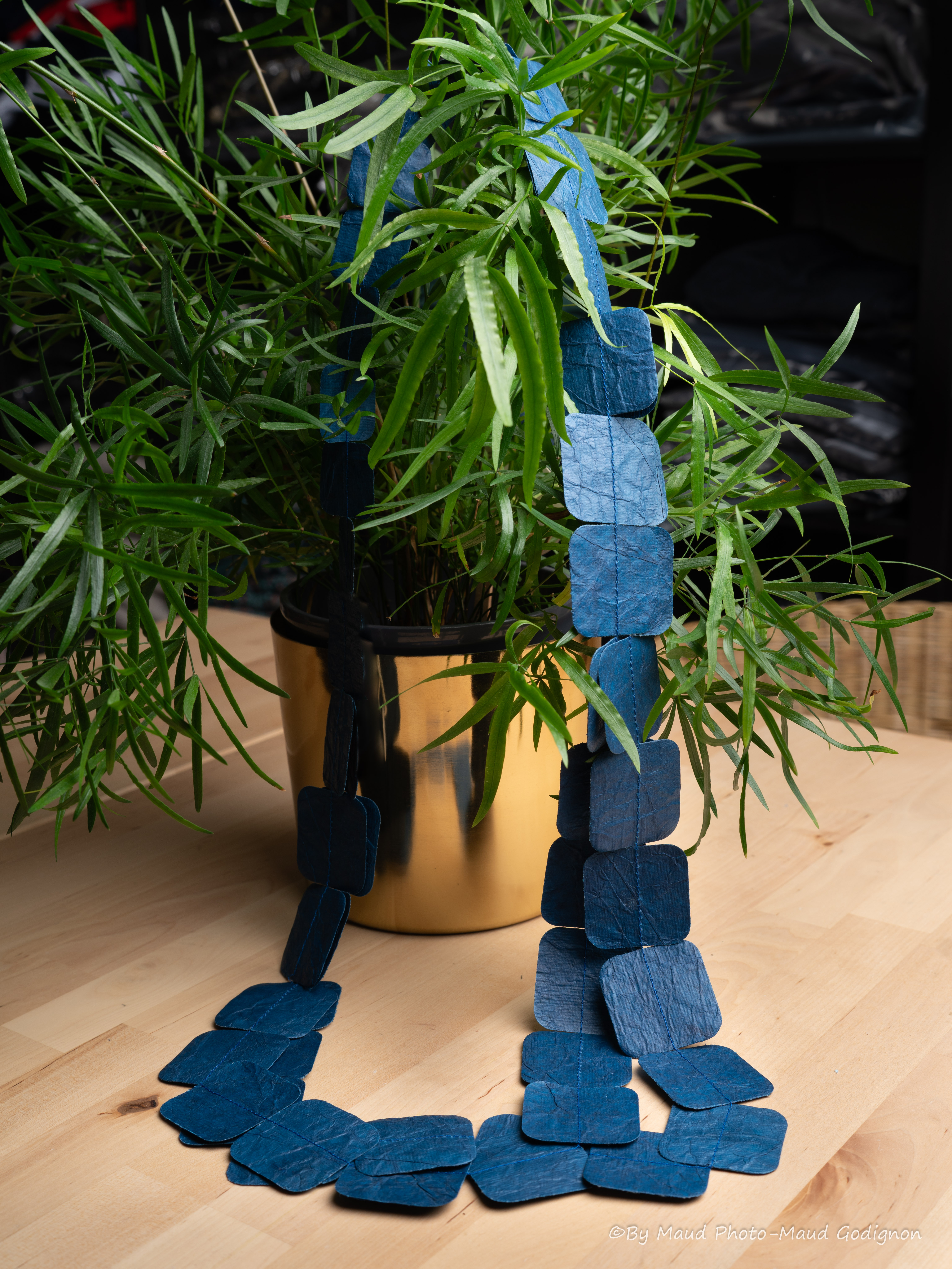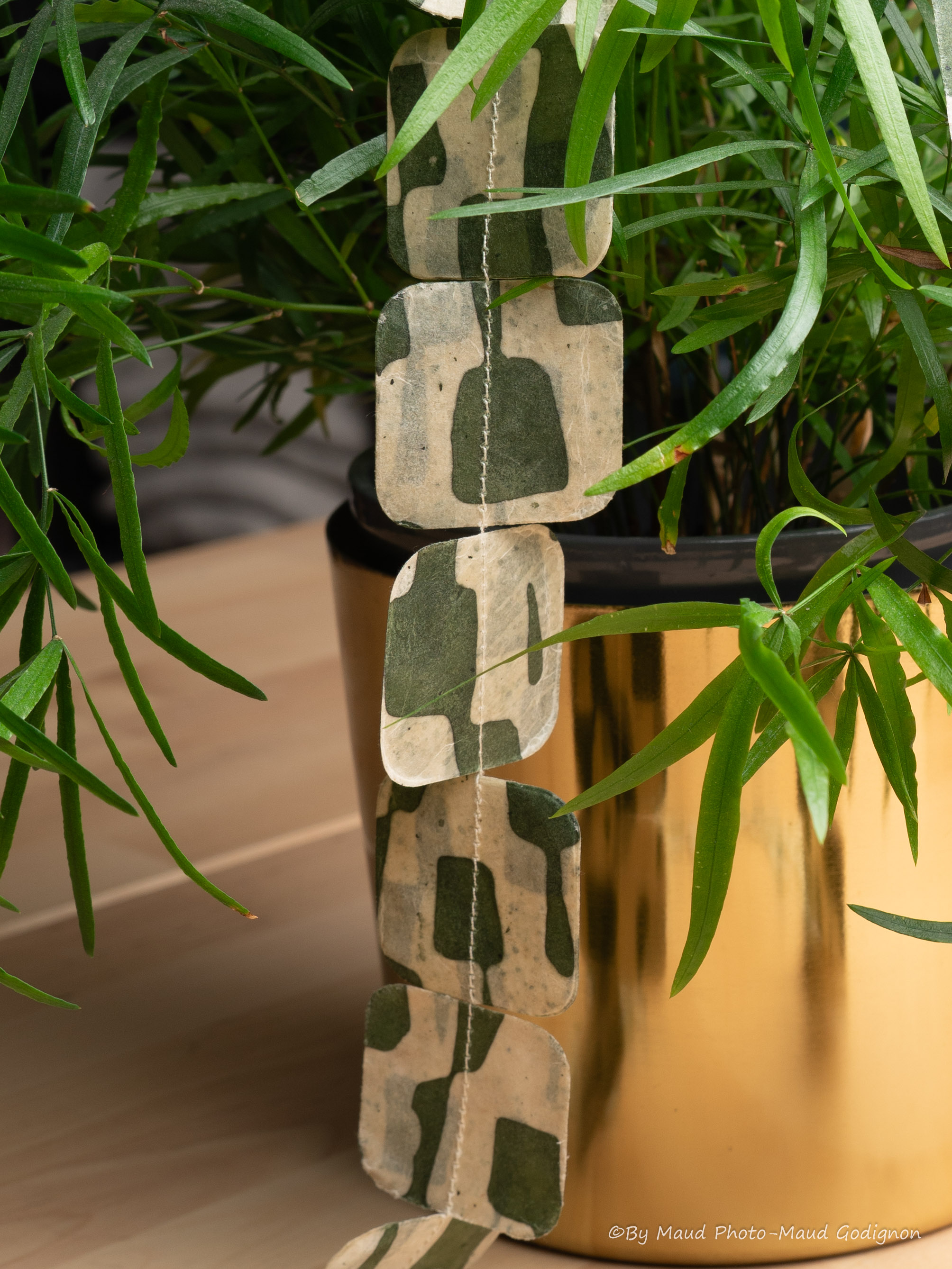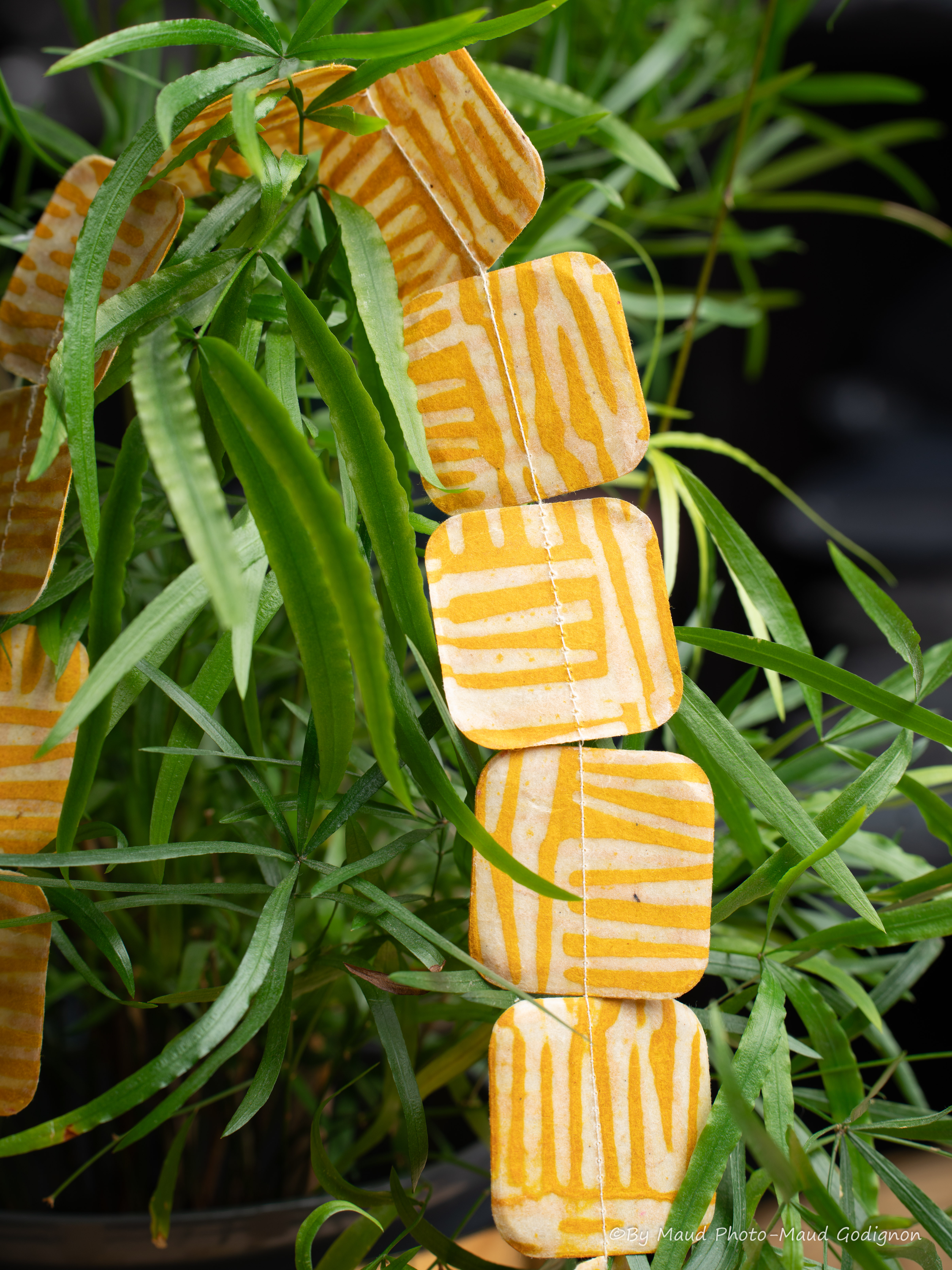 Collier composé d’un rang carrés avec des motifs géométriques en papier (Peut également se porter en double).