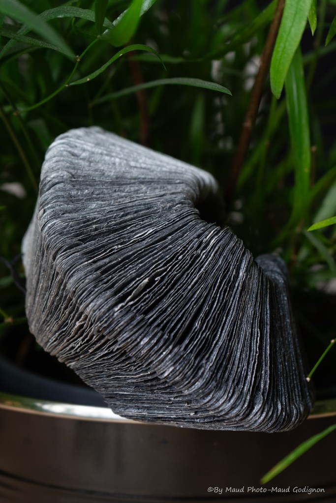 Je joue avec le papier, le découpant et le collant pour créer des volumes et des formes. ma source d’inspiration est la nature et ses créations infinies, ses couleurs infinies, ses textures surprenantes. Le papier est contradictoire, provocateur et humble car éphémère. son utilisation comme matériau trouve ses racines dans la philosophie de l’arte povera, qui redonne de la valeur à l’idée, à l’intuition, à la pensée et à l’individu. lorsque je crée mes œuvres, je recherche inconsciemment le contact primaire, l’émerveillement constant de l’enfance, la vision magique qui transforme le prosaïque et le quotidien en quelque chose de nouveau et de merveilleux. mon processus est intuitif, par mes mains j’entre en contact avec la matière, qui me guide vers la forme finale.