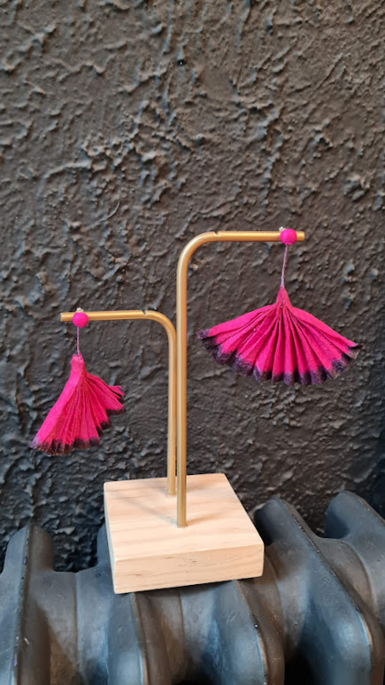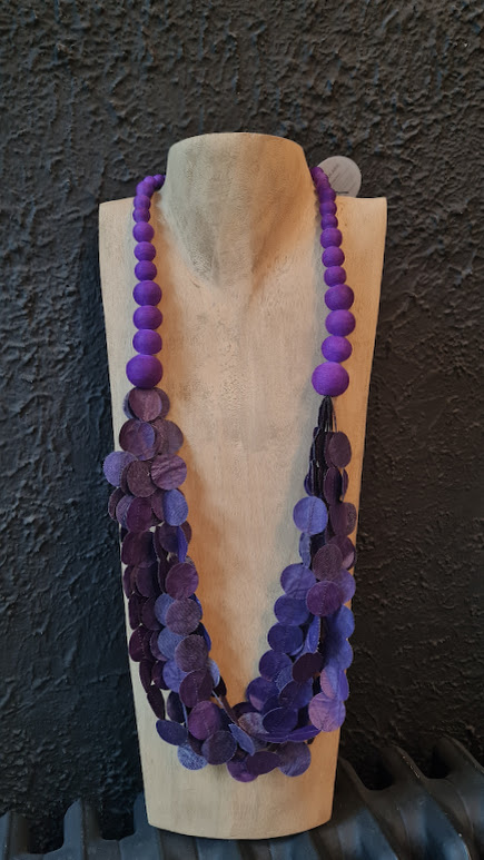 Collier composé d’un long lien avec une fleur à chaque extrémité. Actuellement disponible en rouge et violet.