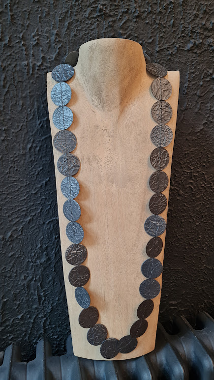 Collier composé d’un rang de ronds en papier imprimé de ronds ayant deux faces différentes (différents coloris).